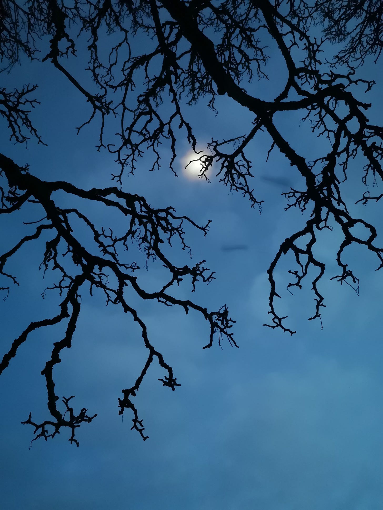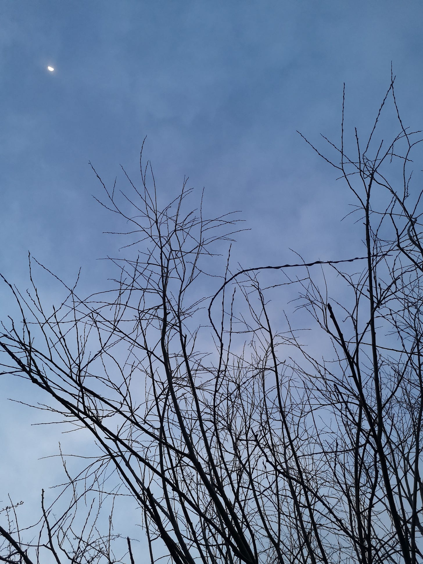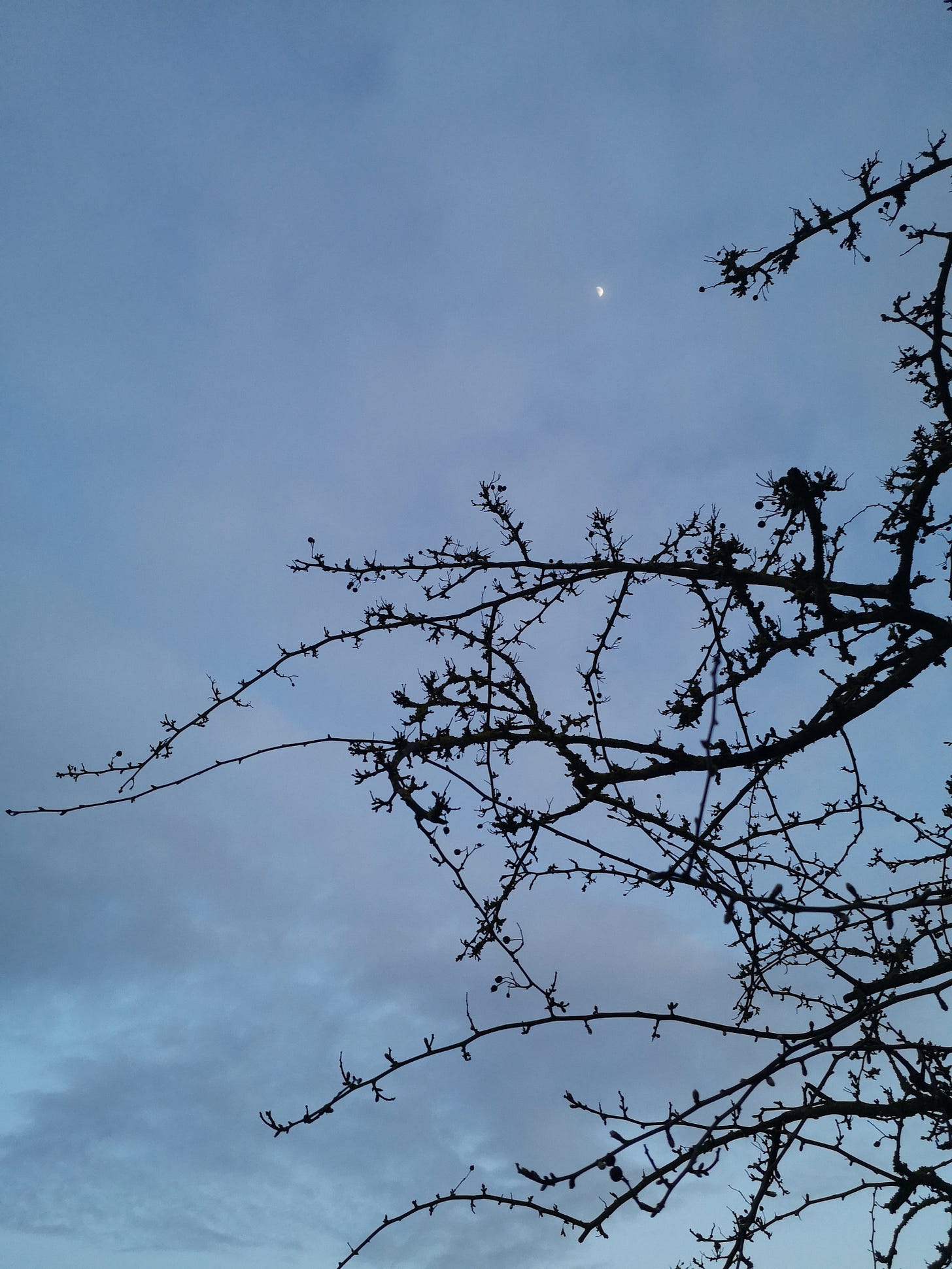 I was gifted a realisation from these trees silhouetted against the sky, with the half moon burning through the thin cloud - that I am further along the path than I had thought, and although I’d spent the day with anxious thoughts tearing at my self-esteem, I am in fact just where I need to be. Learning to navigate the world, sometimes procrastinating, sometimes over-working, often very hard on myself - but often a walk with the trees sets everything in it’s right perspective.