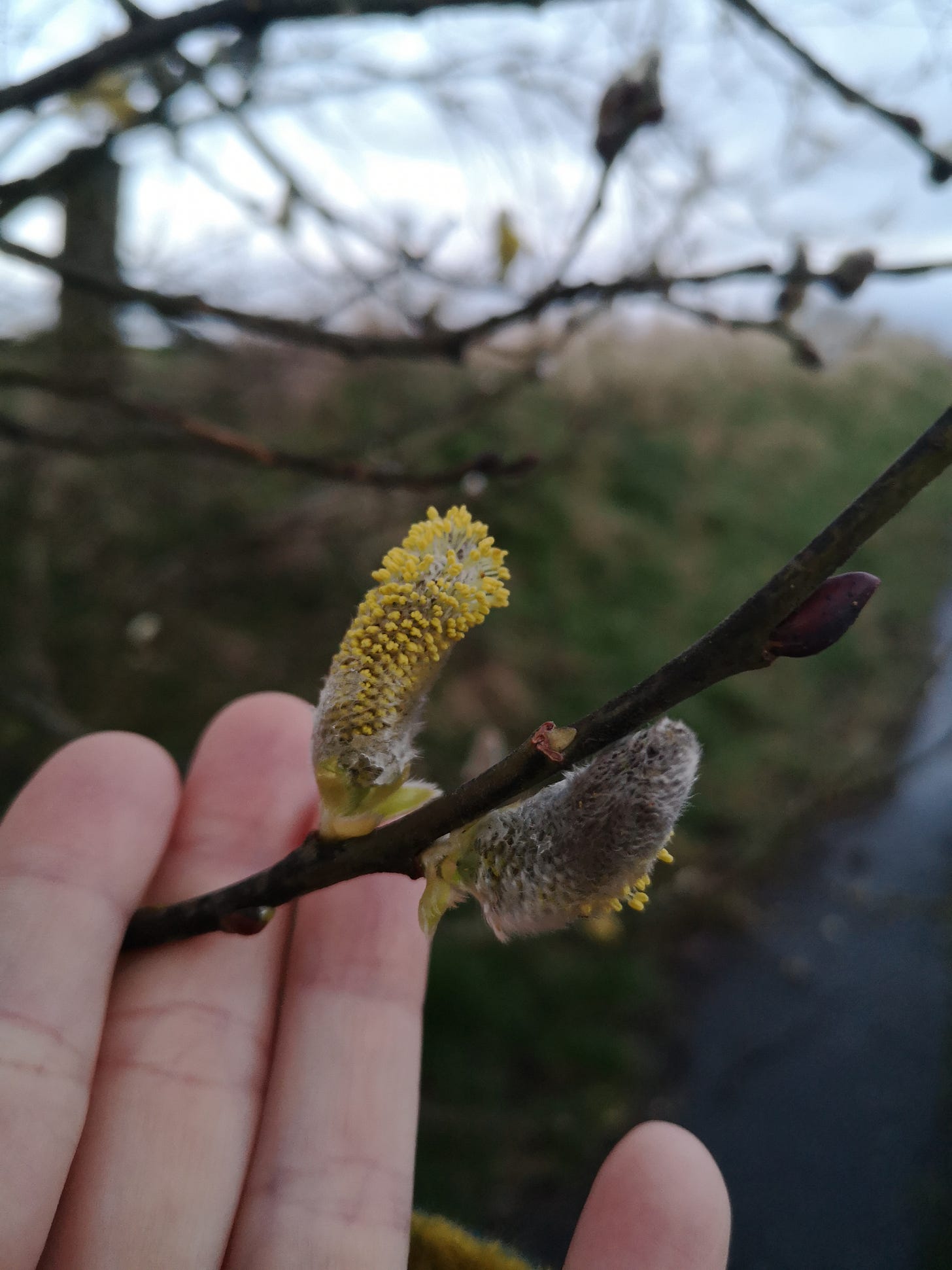 Beech, Sycamore, Laburnum, the humming in my mind lessens. Hawthorn, Holly, Silver Birch, and my steps slow a bit from the frenzied march to a settled walk. I pause by the lovely Goat Willow to stroke the pussy-willow downy buds, enjoying the colours and whisper ‘hello’.